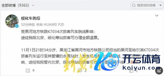 11月2号晚上,哈尔滨铁路局绥化车务段发了告知,说11月1日晚上9点多,黑河至哈尔滨的K7034次列车开到永青站时,背面几节车厢果然脱离了轨谈,不外还好,没东谈主受伤。因为这事儿,北安、绥化这些站的乘客皆能全额退票。