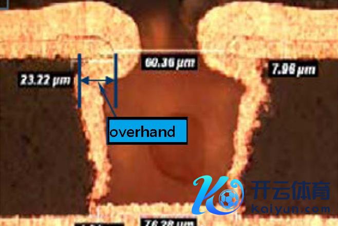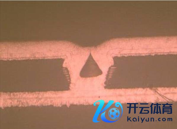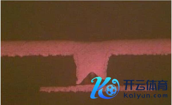盲孔孔底UnderCut主要会影响到PTH千里铜。当孔底角部有Under Cut出现,如果底盘能导电,孔底会有铜接续千里积,而孔角不千里铜,必须比及侧壁和底部镀层邻接在扫数之后工夫形成一个完好意思的镀层,电镀填孔时填孔作用才初始发扬,最终的遵守即是在孔中形成一个三角形的虚浮,见图6。如果底盘不行导电,则电镀时只在孔口和孔侧壁千里积铜,会形成如图7中劣势。