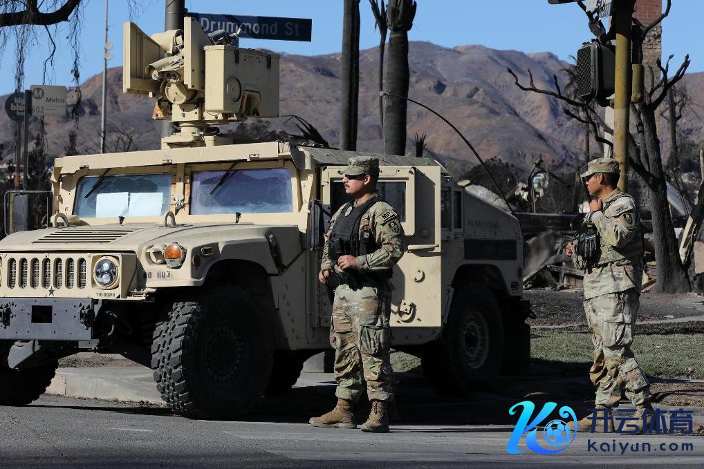 1月13日,好意思国国民警卫队士兵在洛杉矶地区的“帕利塞兹”山失火区握勤。新华社发(邱晨摄)